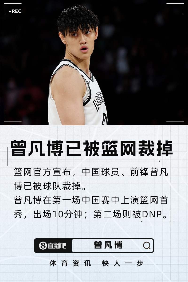 10月15日讯 篮网官方宣布,中国球员、前锋曾凡博已被球队裁掉。此前,曾凡博和篮网签下的是一份Exhibit 10合同,在被裁员之后可以前往篮网的G联盟球队长岛篮网打球。此前北京首钢给曾凡博进行了预注册,他可以选择回CBA征战,今年CBA联赛将于12月份开打。今年NBA中国赛第一战,曾凡博上演篮网生涯首秀,他替补上阵10分06秒没有出手、没有得分,有1次抢断和3个犯规进账;中国赛第二场,曾凡博没有得到出场机会。