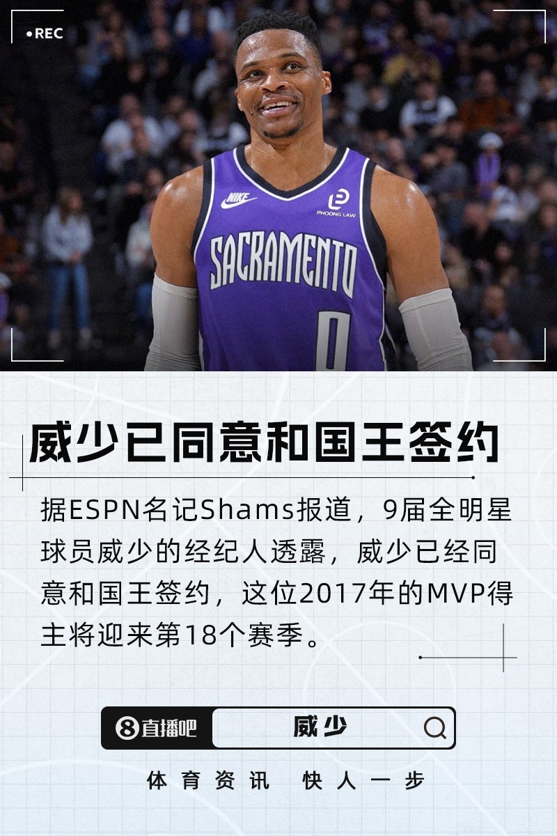 突发新闻:9届全明星球员威少的经纪人&Excel Sports Management的Jeff Schwartz向ESPN透露,威少已经同意和国王签约,这位2017年的MVP得主即将迎来他的第18个NBA赛季;