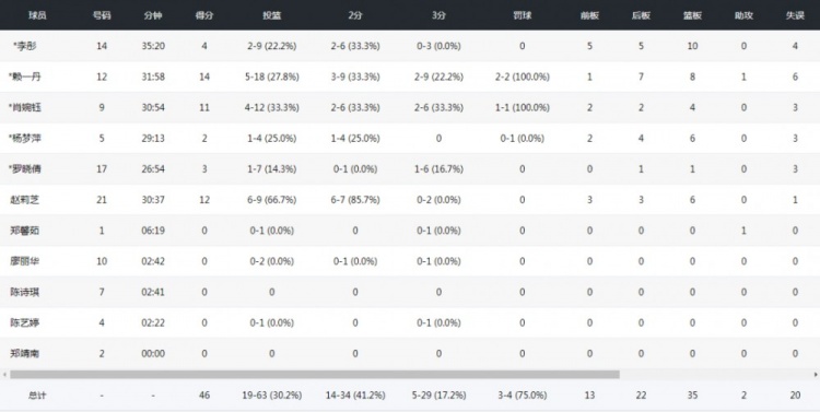 球队方面,全队外线始终打不开局面,三分球29投仅5中,命中率17.2%;且进攻端有些急躁,全场出现20次失误;整场厦门女篮仅2次助攻。球员方面,赖一丹拿到全队最高14分另有8篮板,但18投仅5中效率不高;赵莉芝内线终结效率在线,拿下12分6篮板;肖婉钰也拿到11分4篮板;另外李彤和杨梦萍虽然得分不多,但拼抢篮板很是积极,分别拼下10篮板(5前场篮板)、6篮板。