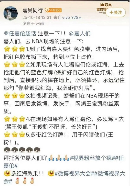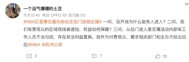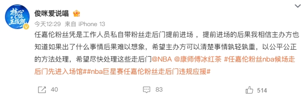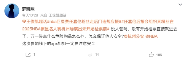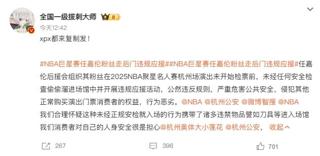 10月18日讯 NBA聚星名人赛将于今晚在杭州进行,在相关活动正在进行的同时,参赛嘉宾应援团之间爆发了线上骂战。根据微博相关热搜词条可以看到,嘉宾任嘉伦的应援粉丝团,被举报存在逃票、无票进入、越过安检、走后门违规应援的情况,同时还爆出部分人员引导粉丝进行其他过激的违规应援行为,存在影响活动现场秩序的风险。目前暂无官方出面回应此事件。