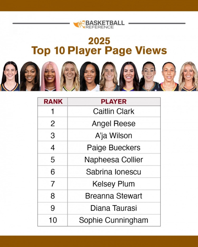 10月18日讯 数据网站Basketball Reference报道,本赛季赛季进行期间站内浏览量最高的WNBA球员TOP10,其中克拉克第一、里斯第二、阿贾-威尔逊第三。详细排名:1、克拉克;2、里斯;3、阿贾-威尔逊;4、佩奇-布克斯;5、科利尔;6、约内斯库;7、普拉姆;8、布里安娜-斯图尔特;9、陶乐西;10、索菲-坎宁安。