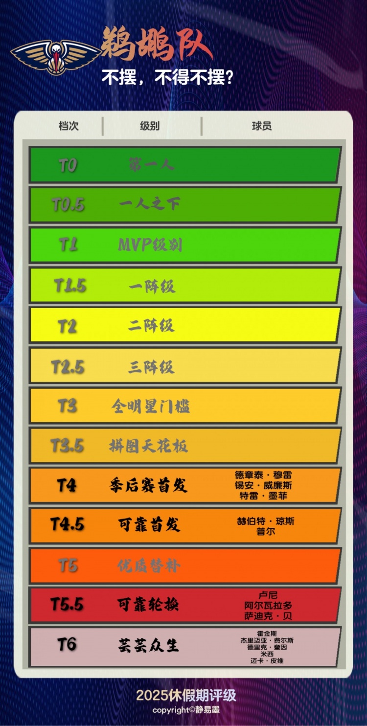哎,不知道怎么评价鹈鹕。普尔说,他跟胖虎磨合后将非常恐怖,我只知道上一次恐怖的主角是他和怀斯曼。胖虎能上演浪子回头金不换的剧情吗?他跟普尔这对胖虎&大雄组合,想一想有那么一点进攻契合度。但哥俩就像初中班级里最羡慕外面黄毛又当不了黄毛的假混混,想上道大哥都嫌他们不靠谱。德章泰·穆雷倒是黄毛气质拉满,能跟大哥搭上两句话,奈何他伤愈复出还有时日,而他那个伤大家都懂,恢复成什么样还得看。