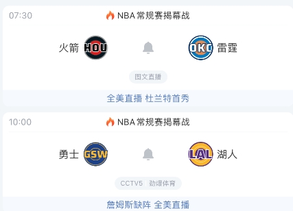 10月21日讯 各位吧友,NBA要回来啦!明天(10月22日),NBA2025-26赛季揭幕。上午7点30分,雷霆将在主场迎战火箭,届时主队众将将领取上赛季的总冠军戒指,而火箭新援杜兰特则是回到故地面对老东家。雷霆大将杰伦-威廉姆斯因为伤病恢复事宜,将缺席本场比赛。火箭这边,范弗里特(预计赛季报销)、芬尼-史密斯和泰特缺阵。10点,湖人将在主场对阵勇士,詹姆斯因坐骨神经痛不会出战本场比赛,东契奇率队迎战,库里、追梦和巴特勒可以出场。