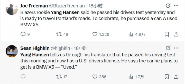 今日最为记者们津津乐道的话题反而是杨瀚森通过了驾照考试,并购买了一辆二手的宝马车。