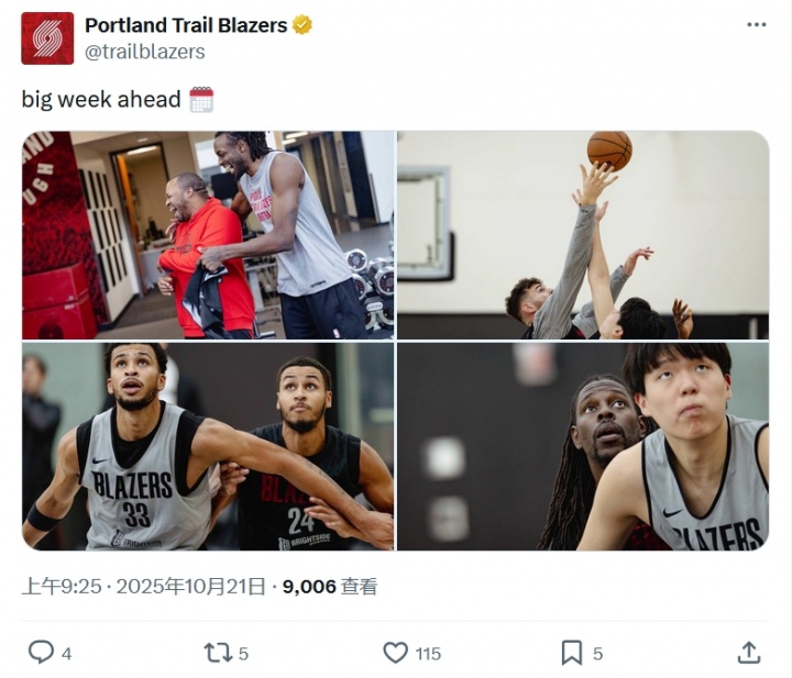 开拓者官方今日上午还发布了杨瀚森的训练照,图中他正与朱-霍勒迪卡位。