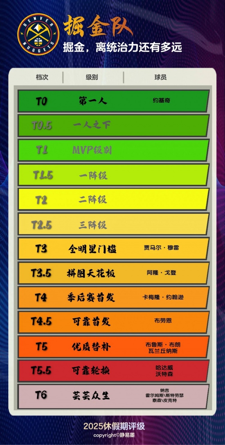 非要说的话,还真是这个似乎签贵了的布劳恩。掘金这几年指望从板凳末掘金的尝试几乎都失败了,布劳恩差不多成了自研成果的独苗。我一开始甚至给他放在了T4,降半档更符合一般印象,并不排除开赛一段时间后调档的可能性。布劳恩要努力证明自己,这不但关系到掘管的脸面和智商,也实打实关系到掘金是什么段位的球队。