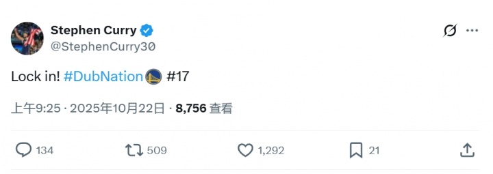 库里赛前发经典备战推特:“Lock in!#勇士国度#第17个赛季。”