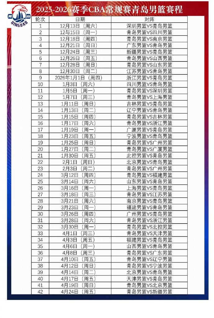 半岛小编整理了青岛男篮新赛季赛程,请收藏!根据赛程安排,青岛国信制药男篮2025-2026赛季CBA常规赛首轮会于12月13日打响,他们将在客场挑战深圳男篮;青岛男篮首个主场比赛定于12月15日举行,对手是实力一般的四川男篮。上赛季,青岛男篮取得第八名的成绩。本赛季,在杨瀚森离队的情况下,球队的实力受到不小的影响,但他们在转会市场上引进了王奕博、胡小龙等实力派球员,并已经提前锁定了韦瑟斯庞等四名外援。球队的前景依然被球迷看好。
