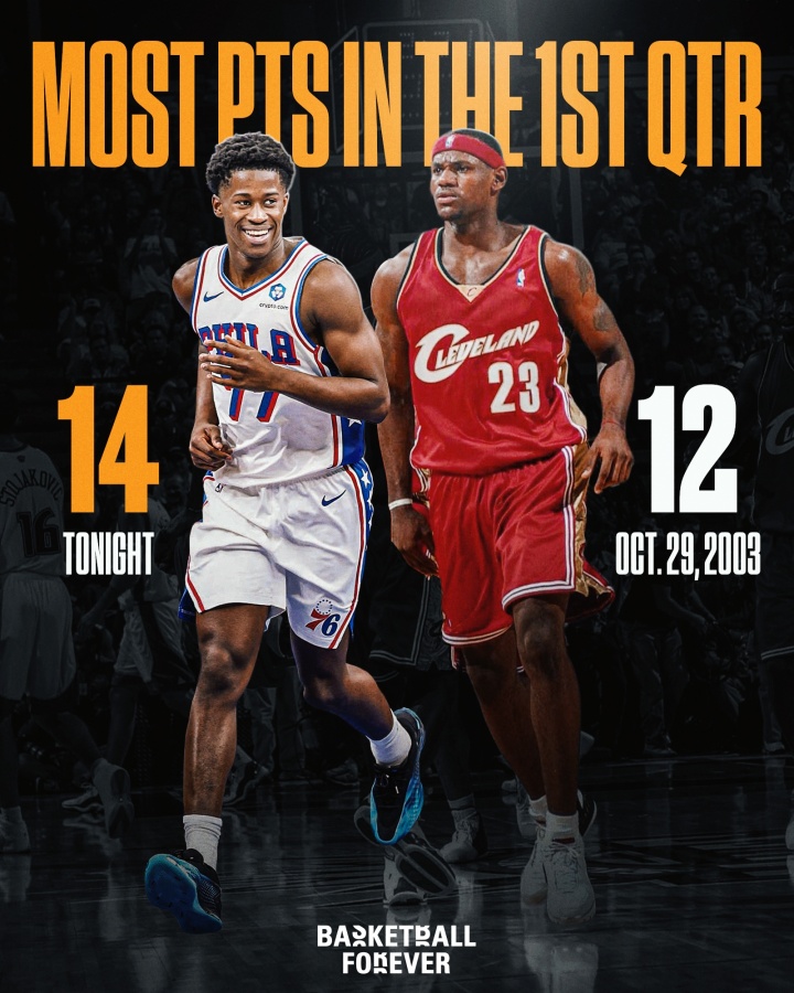 10月23日讯 NBA常规赛,76人客场挑战凯尔特人。首节比赛,76人探花埃奇库姆表现非常抢眼,打了11分钟9投5中,三分6中3、罚球2中1贡献14分2助攻。新秀首秀首节就砍下14分,也创造了NBA历史新秀首秀的首节纪录!此前的纪录是由詹姆斯保持的首秀首节12分(当地时间2003年10月29日)。