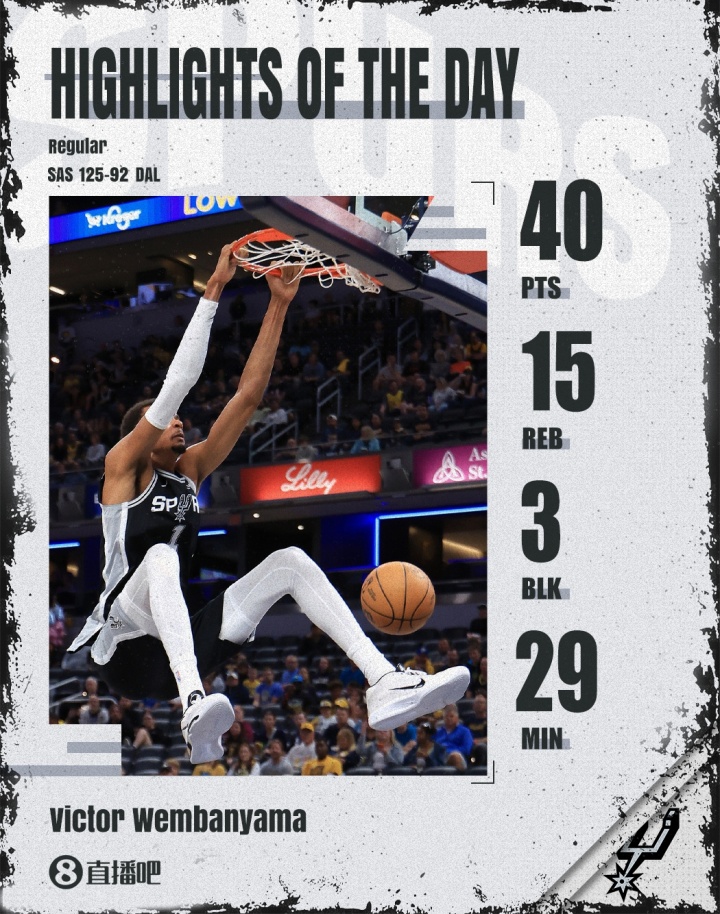 10月23日讯 NBA常规赛,马刺客场125-92大胜独行侠。文班本场比赛继续挥洒无敌天赋,不仅延续过去赛季在天上打球的习惯和防守强度,还减少了三分出手,展现夏天苦练的单打技术,无限冲击内线。浓眉被打到无力反抗,莱夫利也是身背五犯,比赛早早失去悬念。全场比赛,文班仅出场29分40秒,21投15中,三分2中1,罚球11中9,爆砍40分15篮板1助攻1抢断3盖帽,正负值+31。文班揭幕战砍下40分创造马刺队史纪录。