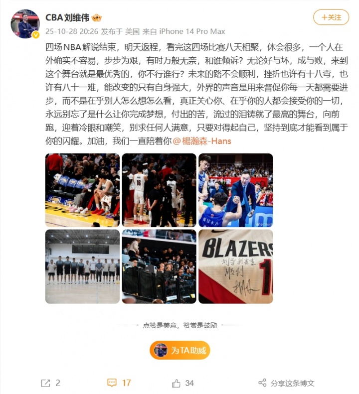 刘维伟写道:“四场NBA解说结束,明天返程,看完这四场比赛八天相聚,体会很多,一个人在外确实不容易,步步为艰,有时万般无奈,和谁倾诉?无论好与坏,成与败,来到这个舞台就是最优秀的,你不行谁行?未来的路不会顺利,挫折也许有十八弯,也许有八十一难,能改变的只有自身强大,外界的声音是用来督促你每一天都需要进步,而不是在乎别人怎么想怎么看,真正关心你、在乎你的人都会接受你的一切,永远别忘了是什么让你完成梦想,付出的苦,流过的泪铸就了最高的舞台,向前跑,迎着冷眼和嘲笑,别求任何人满意,只要对得起自己,坚持到底才能看到属于你的闪耀。加油,我们一直陪着你@杨瀚森。”