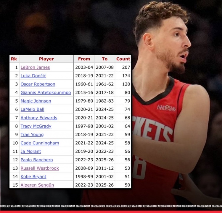 10月29日讯 昨日结束的一场NBA常规赛,火箭主场137-109战胜篮网拿下赛季首胜。申京此役表现高效,全场出战30分钟,11投7中,三分2中2,罚球5中5,拿下21分6篮板6助攻1抢断,正负值+25。这是申京生涯第50次20+5+5,根据数据统计,他是NBA历史上完成50次20+5+5最年轻的球员,也是最年轻的中锋。