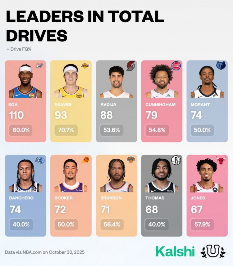 10月30日讯 数据媒体NBA University报道,赛季至今,亚历山大一共突破了110次,是整个NBA突破次数最多的球员。而在前十之中,里夫斯是突破后投篮命中率最高的,他命中率高达70.7%。前十详细名单:亚历山大里夫斯阿夫迪亚康宁汉姆莫兰特班凯罗布克布伦森卡姆-托马斯特雷-琼斯