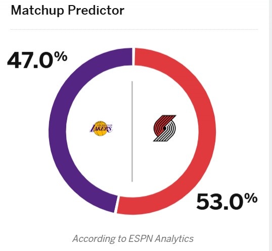 ESPN预测本场比赛胜率,湖人47%略微劣势,开拓者53%。