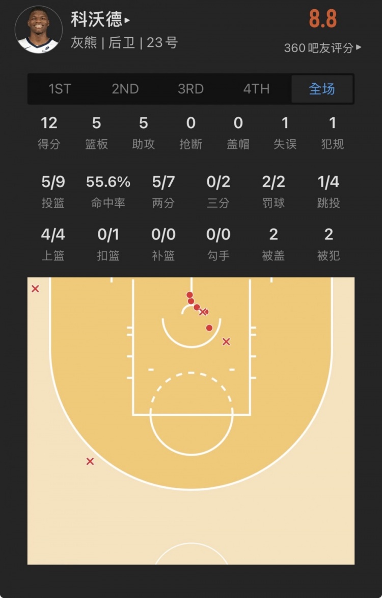 灰熊11号秀 锡德里克-科沃德 登场29.3分钟