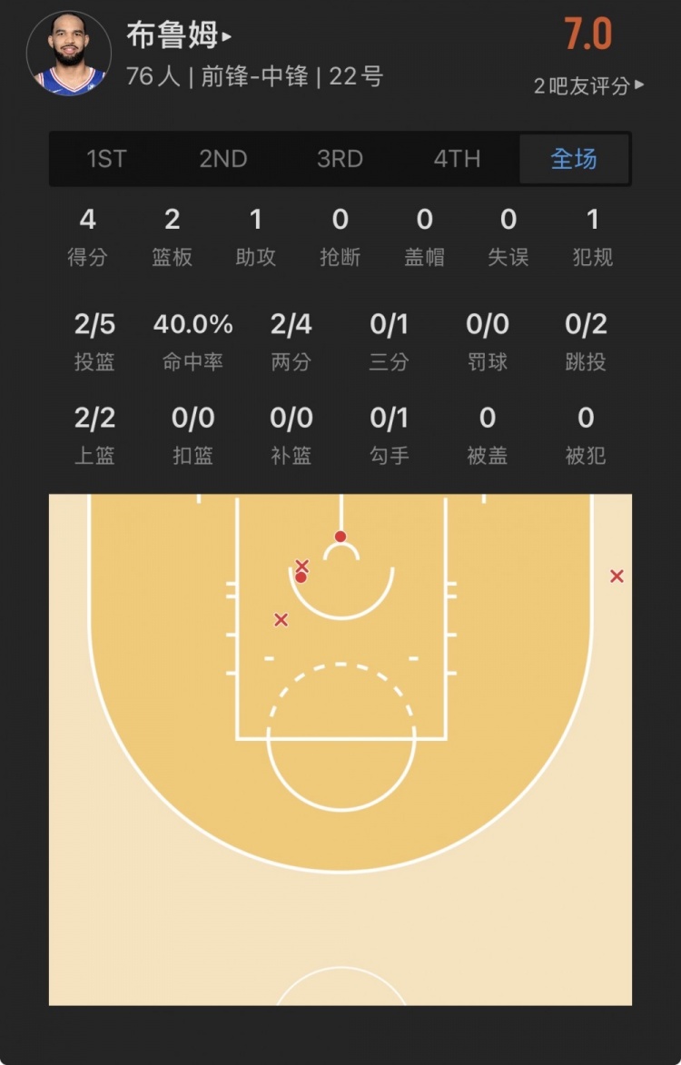 76人35号秀 乔尼-布鲁姆 登场4.7分钟