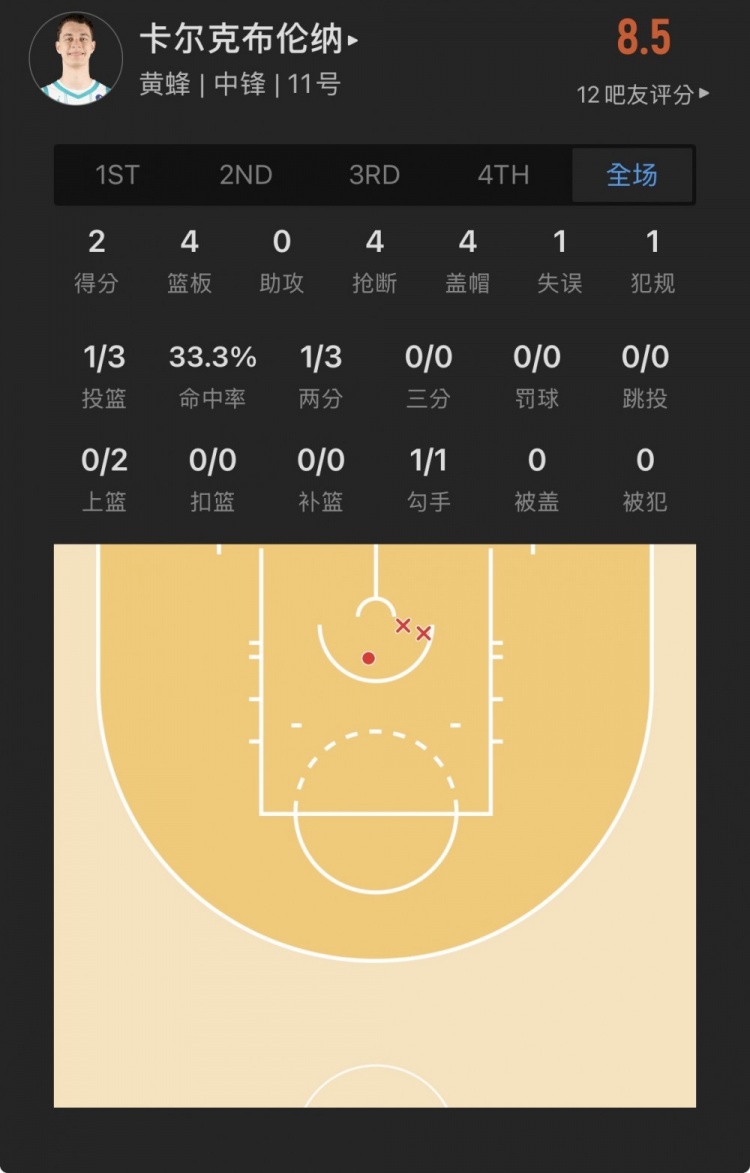 黄蜂34号秀 瑞安-卡尔克布伦纳 登场22.1分钟