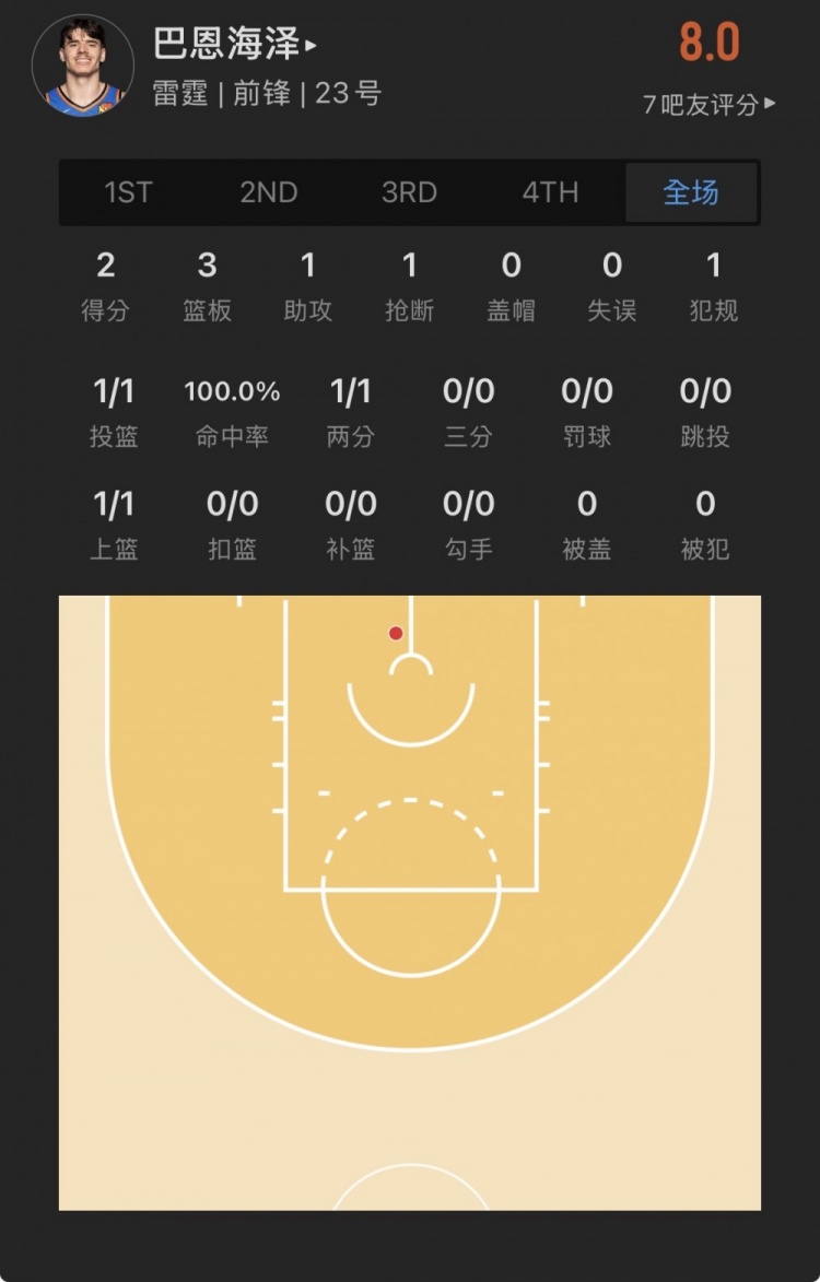雷霆44号秀 布鲁克斯-巴恩海泽 登场6.9分钟