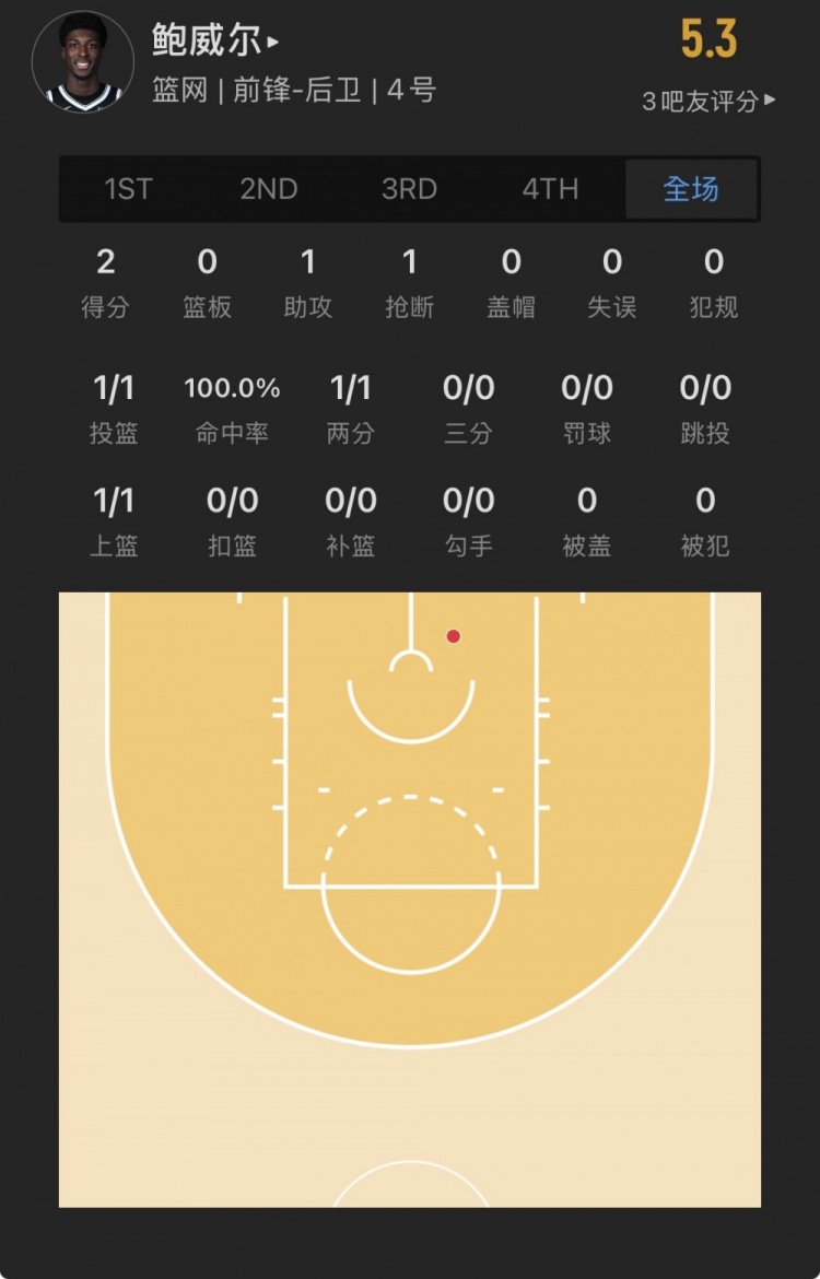 篮网22号秀 德雷克-鲍威尔 登场4.5分钟