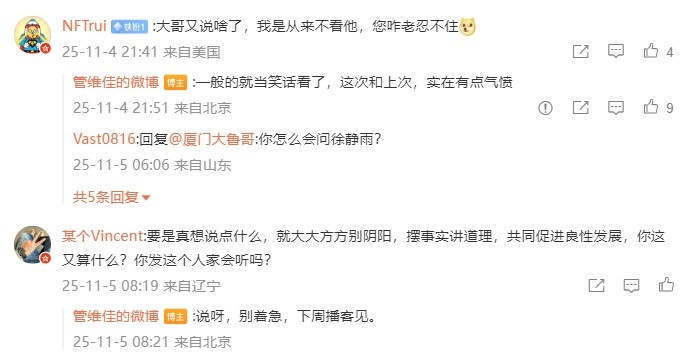 管维佳今日揭晓了答案,他晒出自己在苏群文章下的留言,两人进行了互动: