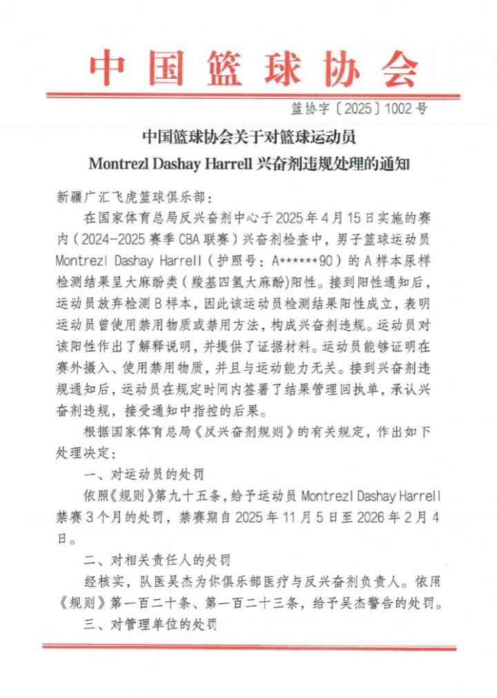 依照《规则》第九十五条,给予运动员Montrezl Dashay Harrell 禁赛3个月的处罚,禁赛期自2025年11月5日至2026年2月4日。