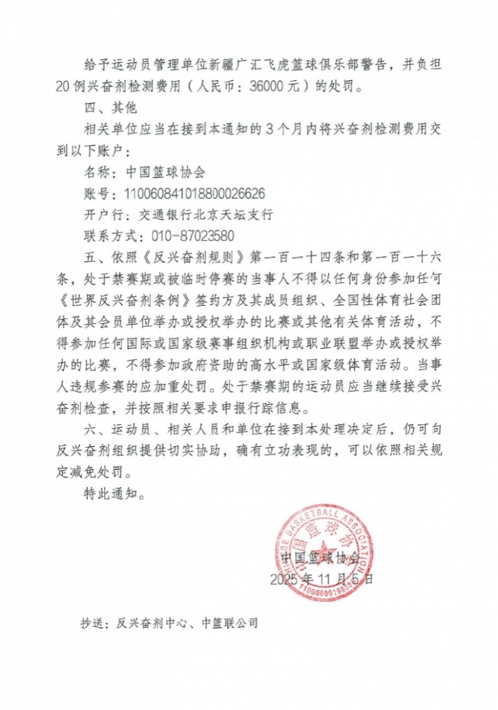 给予运动员管理单位新疆广汇飞虎篮球俱乐部警告,并负担20例兴奋剂检测费用(人民币:36000元)的处罚。