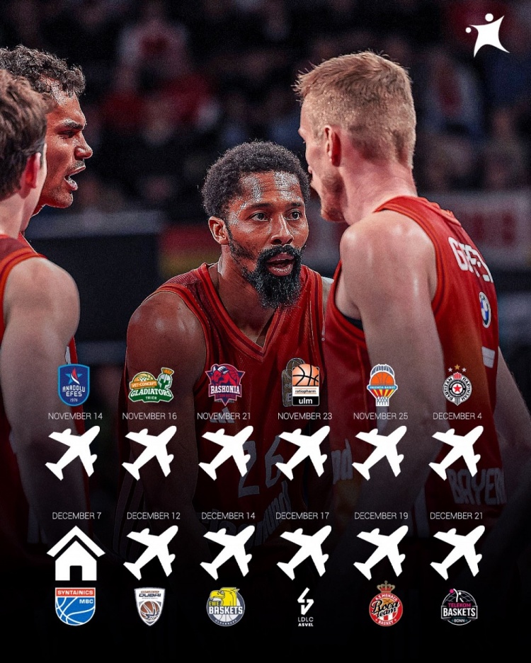 赛程安排上,他们将从11月14日至12月4日连续六场客场比赛,12月7日短暂回到主场对阵MBC魏森费尔斯,随后又开始12月12日至12月21日的五场客场征程,其中包括远赴迪拜的行程(迪拜队也参加欧篮联)。
