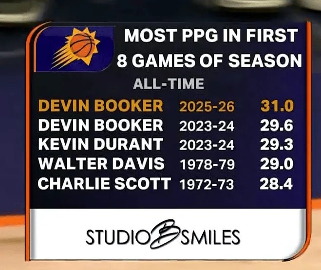 赛季前八场,布克场均砍下31分,是队史开季前八场的最高场均得分。