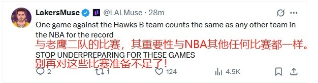 湖蜜议输球:打老鹰2队和其它场次一样重要 今天球员像放假般松散