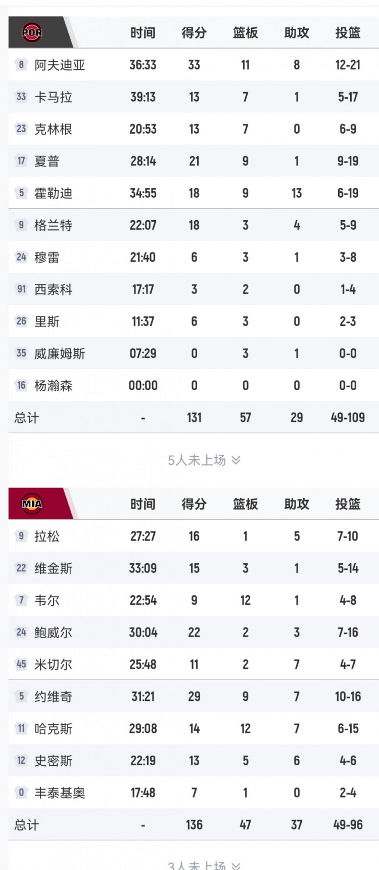 此役双方大打对攻,比赛节奏飞快,热火全队96次出手命中49球,开拓者全队更是109次出手,同样命中49球。