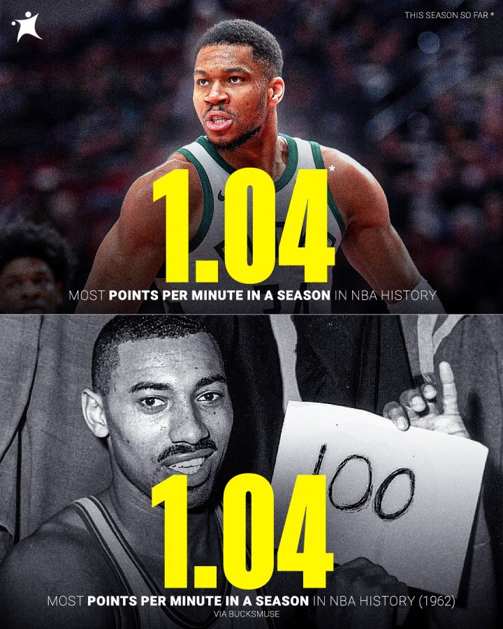 11月10日讯 NBA常规赛,雄鹿115-122不敌火箭。此役过后,雄鹿当家球星扬尼斯·阿德托昆博本赛季场均得分上涨至33.8分,场均出场时间为32.3分钟,他上场每分钟能得到1.04分,追平了NBA历史记录!上一个能在每分钟里得到1.04分的还是1962年的威尔特·张伯伦。张伯伦该赛季场均出战48.5分钟,得到50.4分!本场比赛,阿德托昆博出战35分钟24投15中,三分1中0、罚球14中9拿到37分8篮板3助攻1盖帽,有3失误。