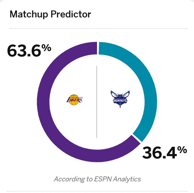 11月10日讯 明天NBA常规赛,湖人将客战黄蜂。ESPN对本场比赛胜率进行了预测:湖人胜率为63.6%,黄蜂则是36.4%。湖人方面,因腹股沟伤势缺席了3场的里夫斯仍出战成疑;黄蜂方面,除了布里奇斯明天出战成疑外,鲍尔和米勒都将缺战。