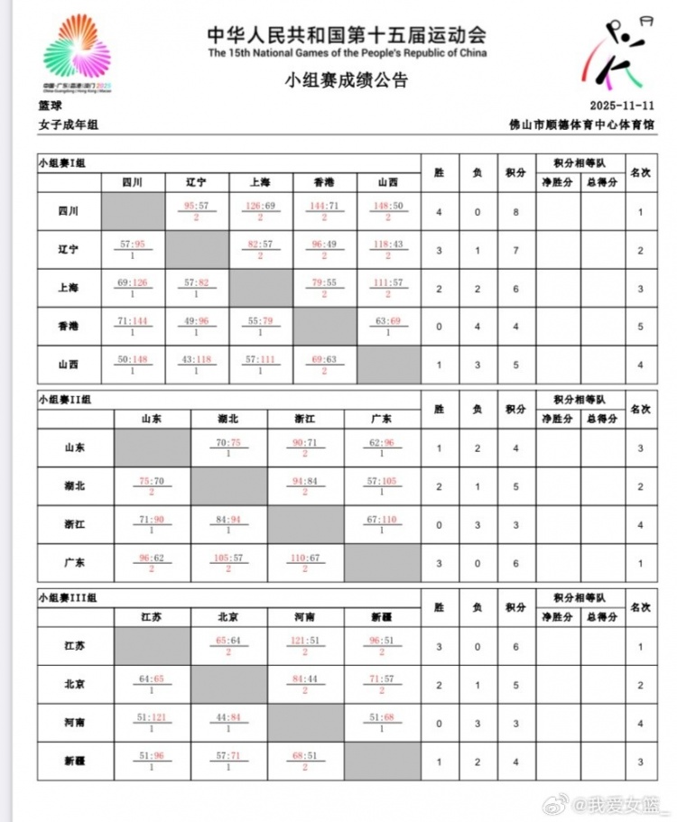 【全运会女篮成年组第五日综述:八强出炉 四川、广东、江苏头名晋级】第十五届全运会女篮成年组今日在广东佛山顺德结束全部小组赛赛事,最终四川队、广东队、江苏队、辽宁队、湖北队和北京队六支球队名列各组前两名直接晋级。三个小组的第三名中,山东队(净胜分-20),新疆队(净胜分-42)、上海队(净胜分-28),因此山东队和上海队获得晋级资格。