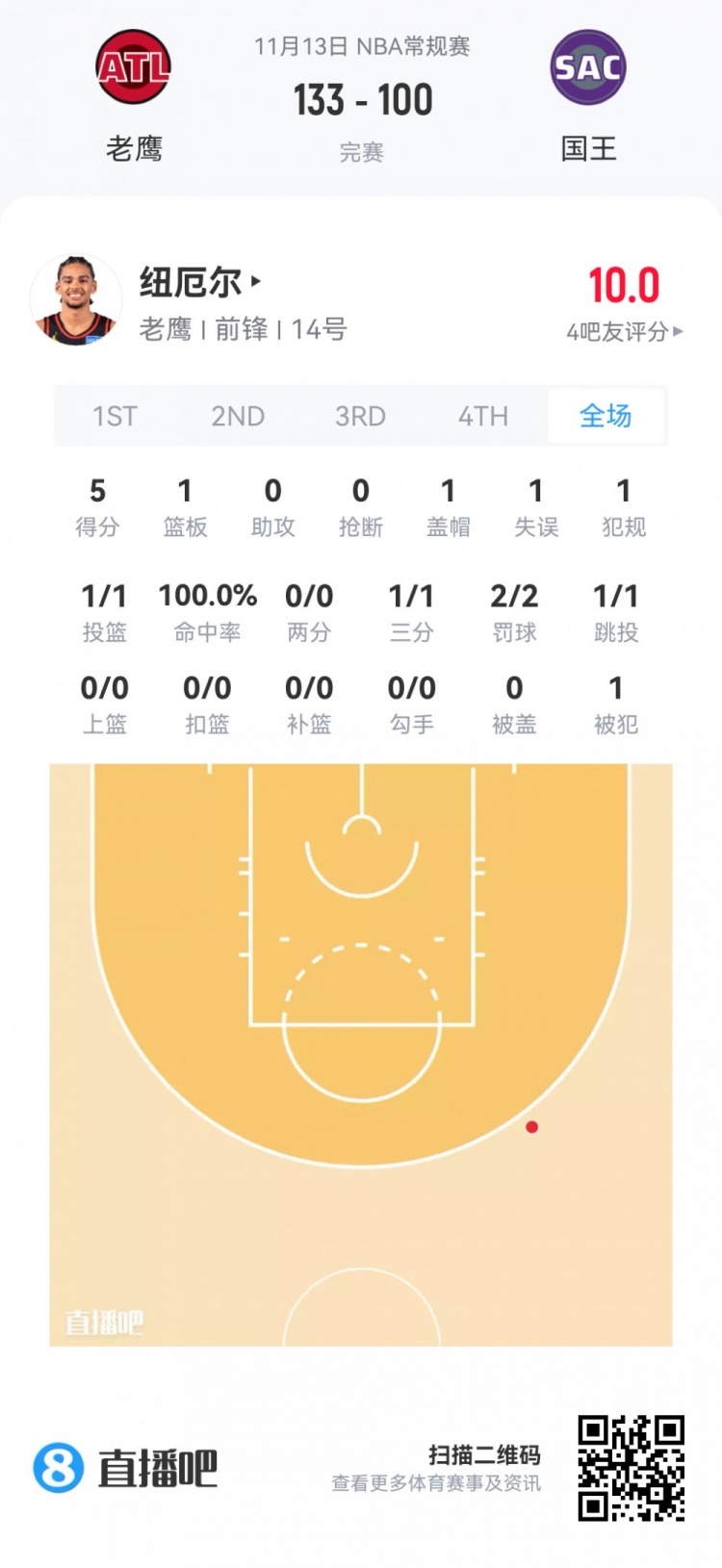 国王首轮24号秀尼克·克利福德 登场30.6分钟