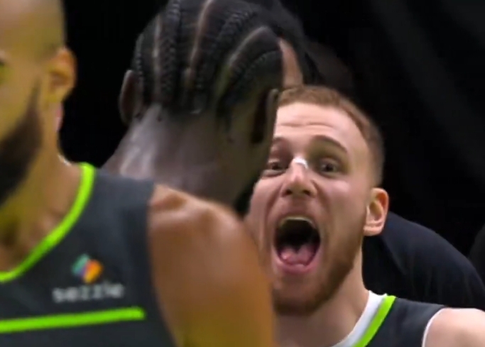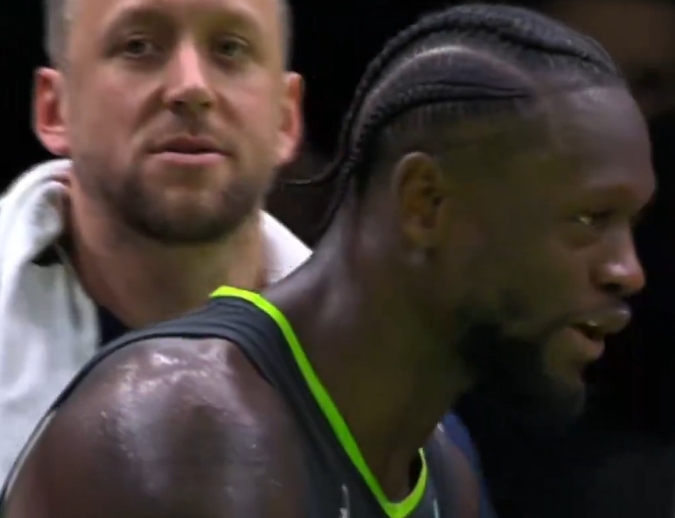 比赛最后时刻,威少压哨篮板达成三双,兰德尔转头对迪文说:“He got a Westbrook triple double(他拿了一个威少式的三双。).”迪文则是表情夸张地回应兰德尔的言论。GIF-唇语解读:威少压哨三双,兰德尔f发言嘲讽