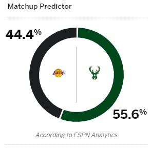 今天ESPN预测了本场胜率,湖人为44.4%,雄鹿则是55.6%。