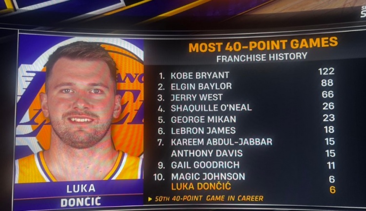 11月16日讯 NBA常规赛,湖人119-95击败雄鹿。结束了5连客的赛程。此役,东契奇继续扛起球队,19投9中,三分11中5,罚球20中18,狂砍41分9篮板6助攻1抢断2盖帽,正负值+25!东契奇在湖人的40+场次冲进前十,详情如下:1、科比:122次2、埃尔金·贝勒:88次3、杰里·韦斯特:66次4、沙奎尔·奥尼尔:26次5、乔治·麦肯:23次6、詹姆斯:18次7、贾巴尔/浓眉:15次9、盖尔·古德里奇:1110、魔术师约翰逊/东契奇:6次
