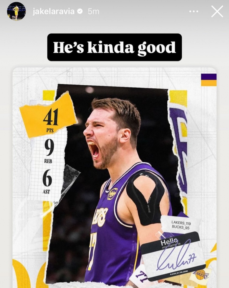 11月16日讯 NBA常规赛,湖人119-95击败雄鹿。此役,东契奇19投9中,三分11中5,罚球20中18,狂砍41分9篮板6助攻1抢断2盖帽。赛后湖人球员拉拉维亚更新IG动态转发东契奇海报,并称赞道:“他挺厉害的。”本场比赛拉拉维亚出战36分32秒,10投仅1中,三分4中0,罚球2中2拿到4分6篮板1助攻2抢断,正负值+26全场最高。