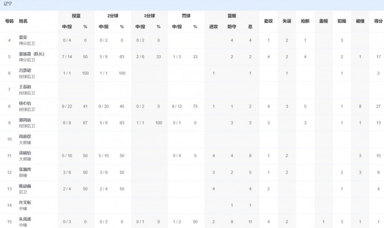 11月16日讯 全运会女篮U22组9-12名排位赛,辽宁U22全运女篮80-67战胜天津U22全运女篮。辽宁队方面,林心怡27分2篮板4助攻5抢断,夏瑜蔓17分2篮板4助攻4抢断。天津队方面,崔雨萱24分3篮板,刘婉15分2篮板1助攻1抢断。