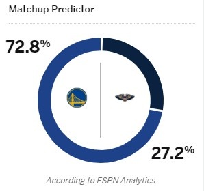 11月16日讯 明天上午08:00NBA常规赛,勇士客场挑战鹈鹕。今日ESPN给出本场获胜概率预测,勇士72.8%,鹈鹕27.2%。本场比赛,勇士球员库明加因膝伤将继续缺席;锡安·威廉森(左腿筋拉伤)和乔丹·普尔(左大腿拉伤)状态升级为出战成疑。