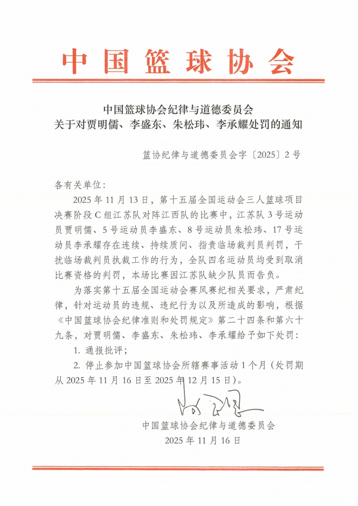 11月16日讯 中国篮球协会纪律与道德委员会官方宣布,给予全运会三人篮球项目江苏队队员贾明儒、李盛东、朱松玮和李承耀通报批评和停止参加中国篮协所辖赛事活动1个月的处罚,原因是他们四人存在连续、持续质问、指责临场裁判员判罚、干扰临场裁判员执裁工作的行为。