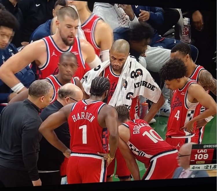 11月17日讯 NBA常规赛,快船118-121惜败凯尔特人。一位快船球迷赛后晒出了快船在最后21.8秒(当时哈登造成沃尔什三分犯规、裁判回看阶段)替补席图片,当时快船球员围着商讨战术,小范画战术,而主教练泰伦·卢在外圈看。相关阅读:解说:快船最后一攻战术设计堪称精妙 但应是小范画的&卢在最外圈