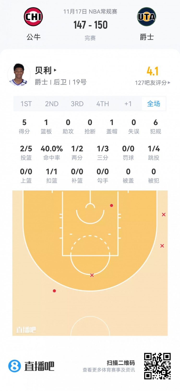 爵士首轮5号秀埃斯·贝利 登场10.4分钟