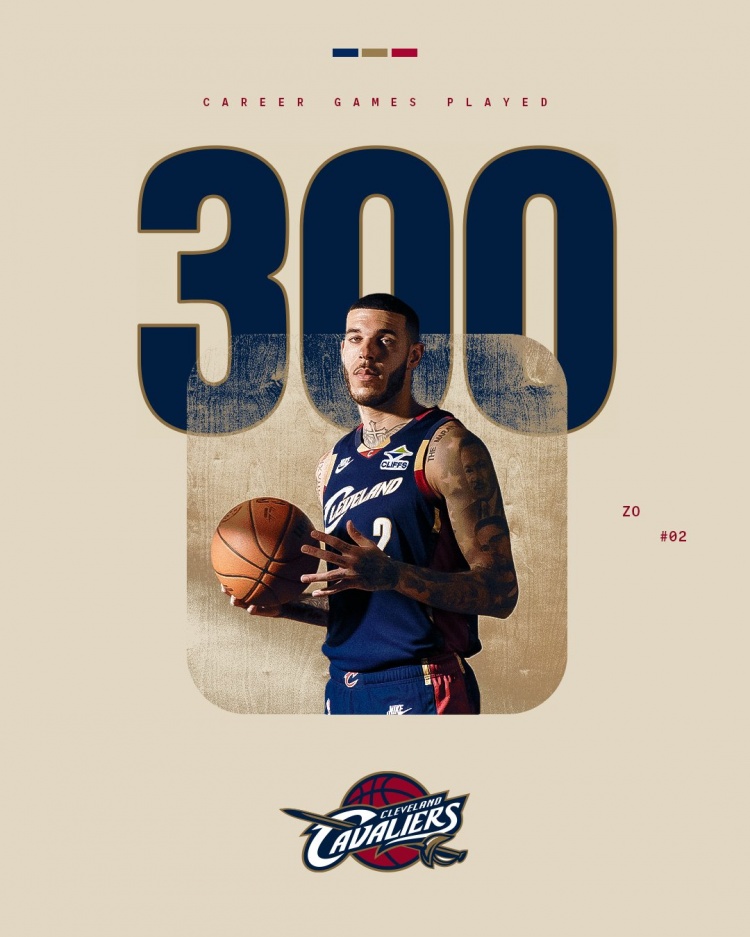 11月20日讯 NBA常规赛,骑士主场对阵火箭。比赛首节,骑士球员朗佐·鲍尔替补出战。球队官方也晒出海报,祝贺鲍尔达成生涯300场里程碑。朗佐·鲍尔前299场比赛,场均得到11.2分5.4篮板5.8助攻1.6抢断,三项命中率为39.6/36.1/60.2%。