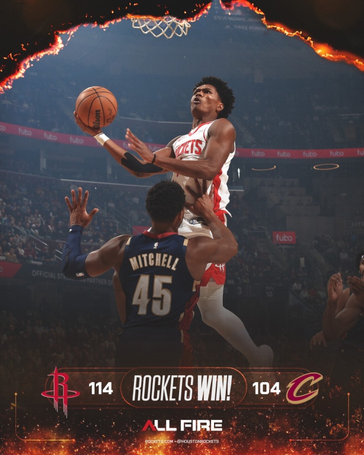 11月20日讯 火箭客场114-104力克骑士,取得5连胜。赛后火箭官方发布赢球海报,阿门力压米切尔上篮登上封面。本场比赛阿门打了40分钟14投6中,三分1中0拿到12分9篮板6助攻4抢断,正负值+8。