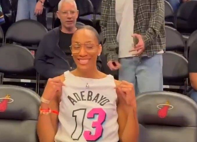 11月20日讯 NBA常规赛,热火110-96战胜勇士。此役,热火内线阿德巴约复出表现不错,尤其是末节带队成功收下比赛,在29分钟的时间里,投篮13中7,三分球4中3,罚球3中3,拿到20分7篮板3助攻1抢断2盖帽的数据,正负值+15。赛前,阿德巴约女友、本赛季WNBA总冠军并包揽DPOY、MVP和FMVP的阿贾·威尔逊身穿男友球衣现场观战,前后反穿专门露出阿德巴约的名字与号码。GIF-阿贾前后反穿阿德巴约球衣观战