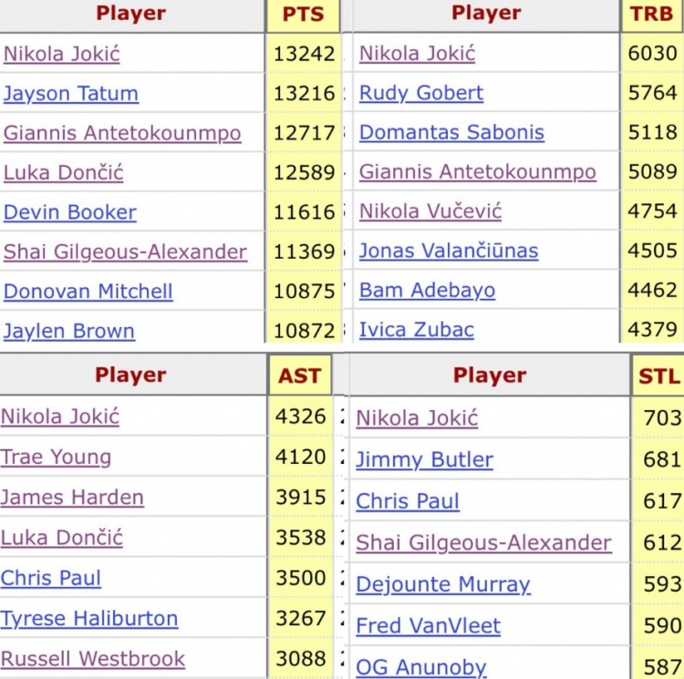 在这场比赛后,约基奇近10年的总得分超越了塔图姆;美媒Crazy Stats给出了一项非常疯狂的数据统计,在最近的10年(包括季后赛)中,约基奇的总得分、总篮板、总助攻和总抢断皆位列同期第一多,这也是NBA历史首次出现;上赛季70年代,贾巴尔曾有三项居同期第一。