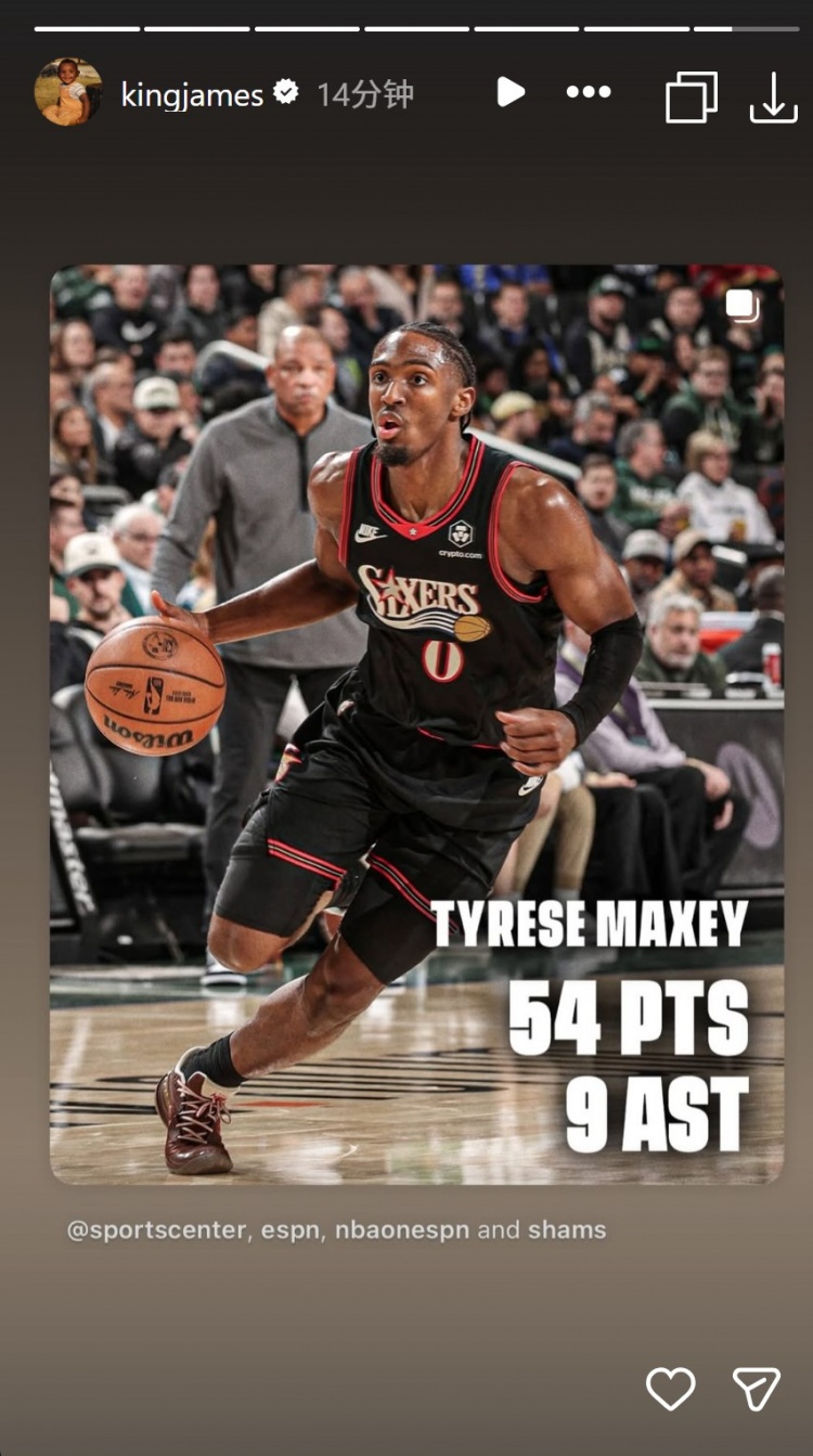 11月21日讯 今天NBA常规赛,76人客场123-114加时力克雄鹿。赛后湖人球星詹姆斯转发了马克西数据海报——54分9助攻。本场比赛,马克西出战46分钟,30投18中,三分15中6,罚球14中12砍下生涯新高的54分(此前是52),另有5篮板9助攻3抢断3盖帽。