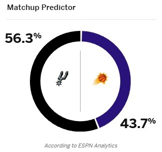 11月23日讯 明天上午09:00NBA常规赛,马刺客场对阵太阳。今天ESPN给出本场获胜概率预测,马刺为56.3%,太阳为43.7%。据此前报道,文班因伤不随队前往接下来的四连客。而太阳主将杰伦·格林因腿筋拉伤已缺席过去6场比赛。