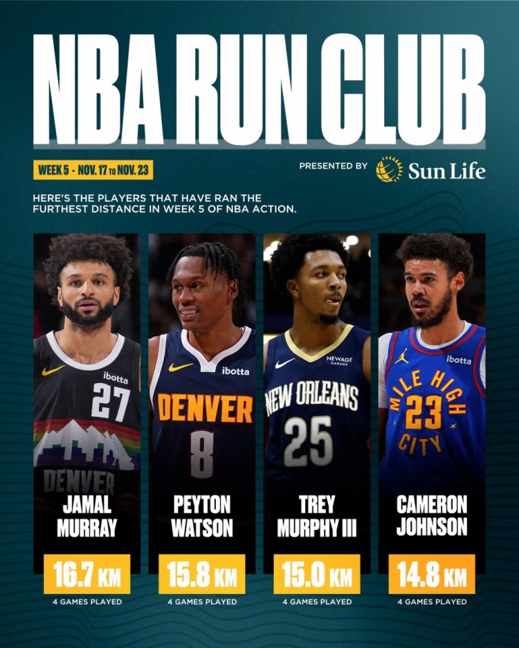 11月24日讯 NBA加拿大官方晒出了本赛季第五周(11月18日-24日)球员总跑动距离榜,具体如下(均打了四场比赛):1、贾马尔·穆雷 16.7公里2、佩顿·沃特森 15.8公里3、特雷·墨菲 15公里4、卡梅隆·约翰逊 14.8公里上周榜单>>>赛季第四周总跑动距离:小瓦格纳17.9km第1 弗拉格&马卡17.4km